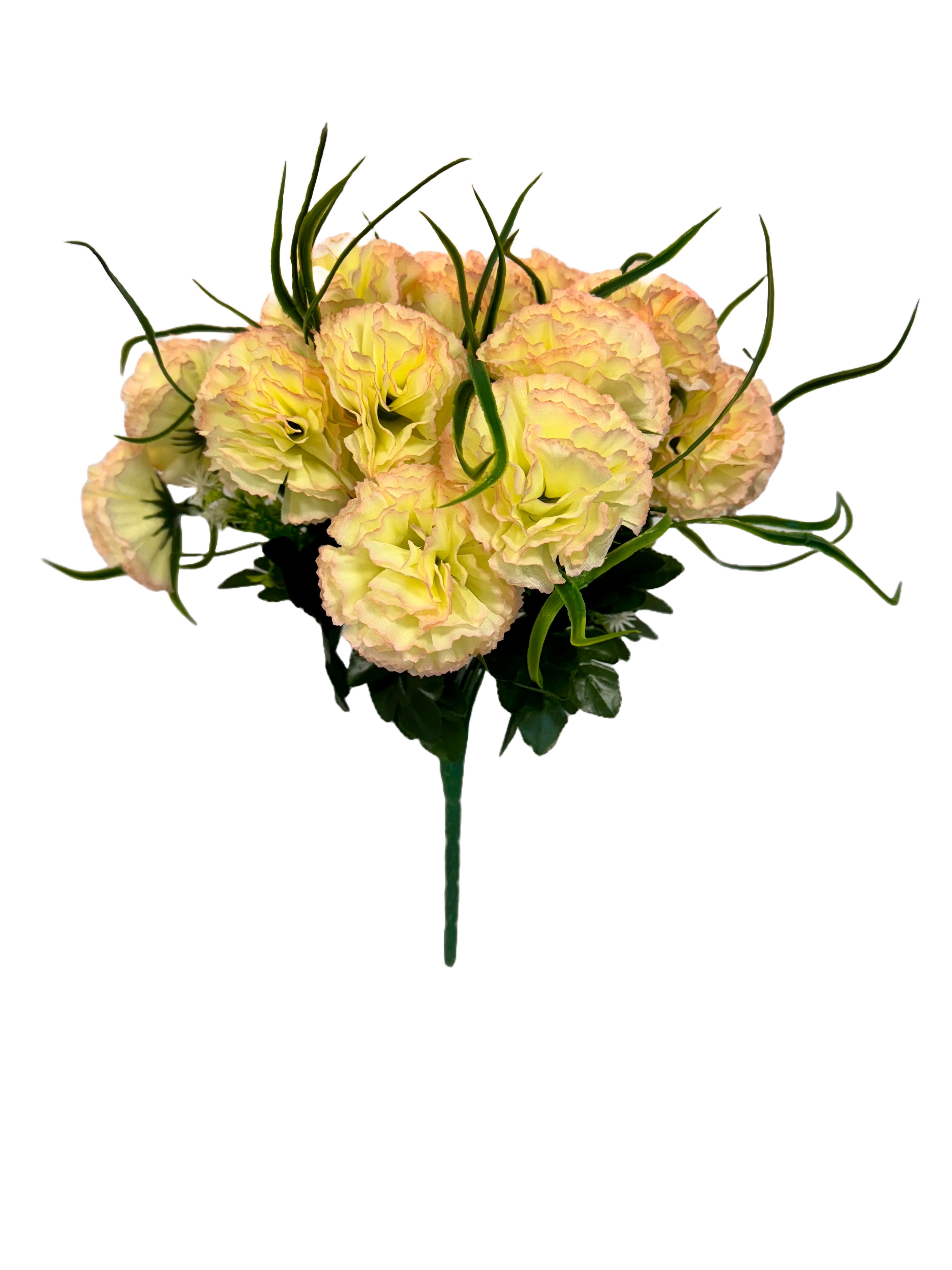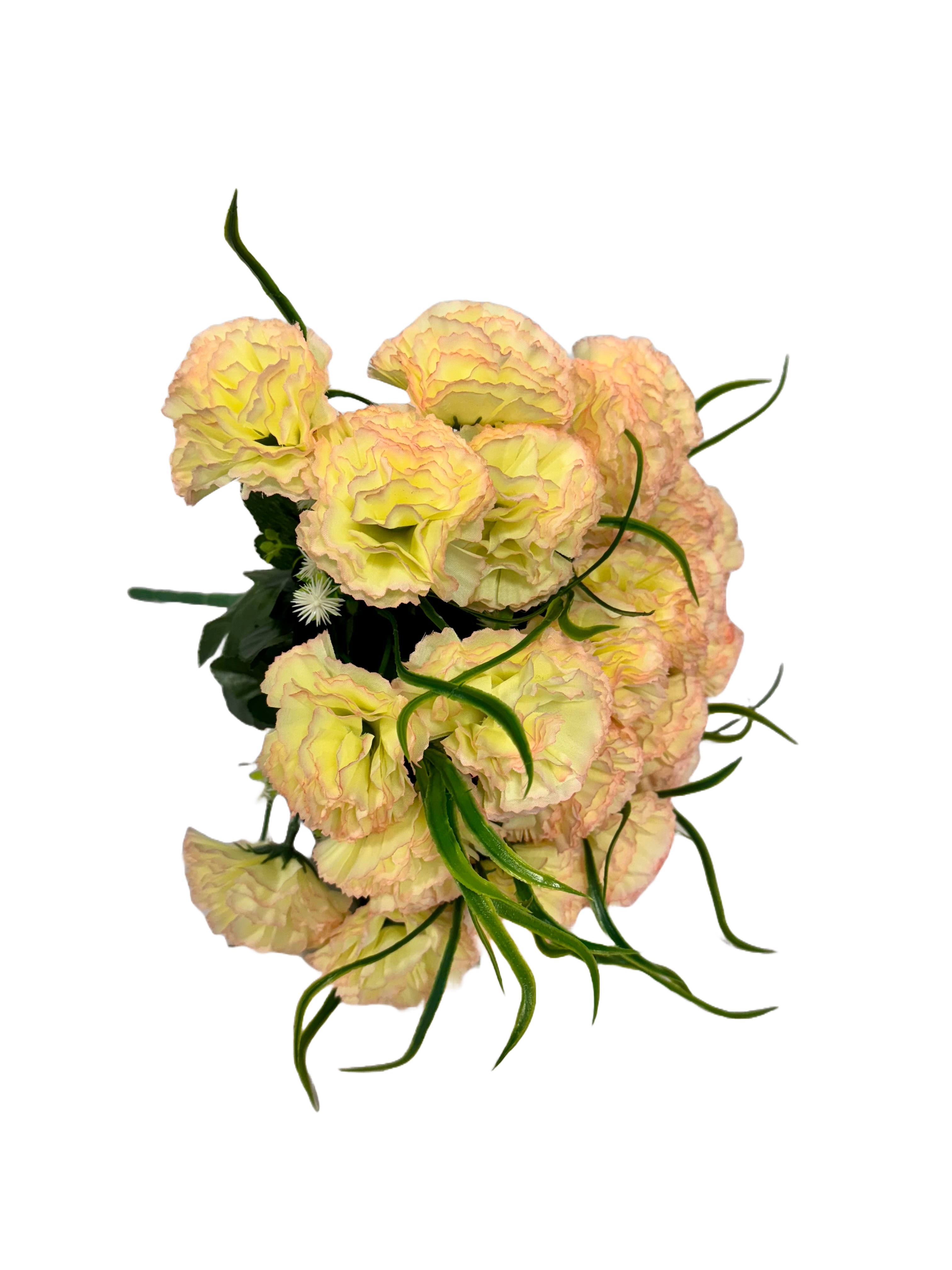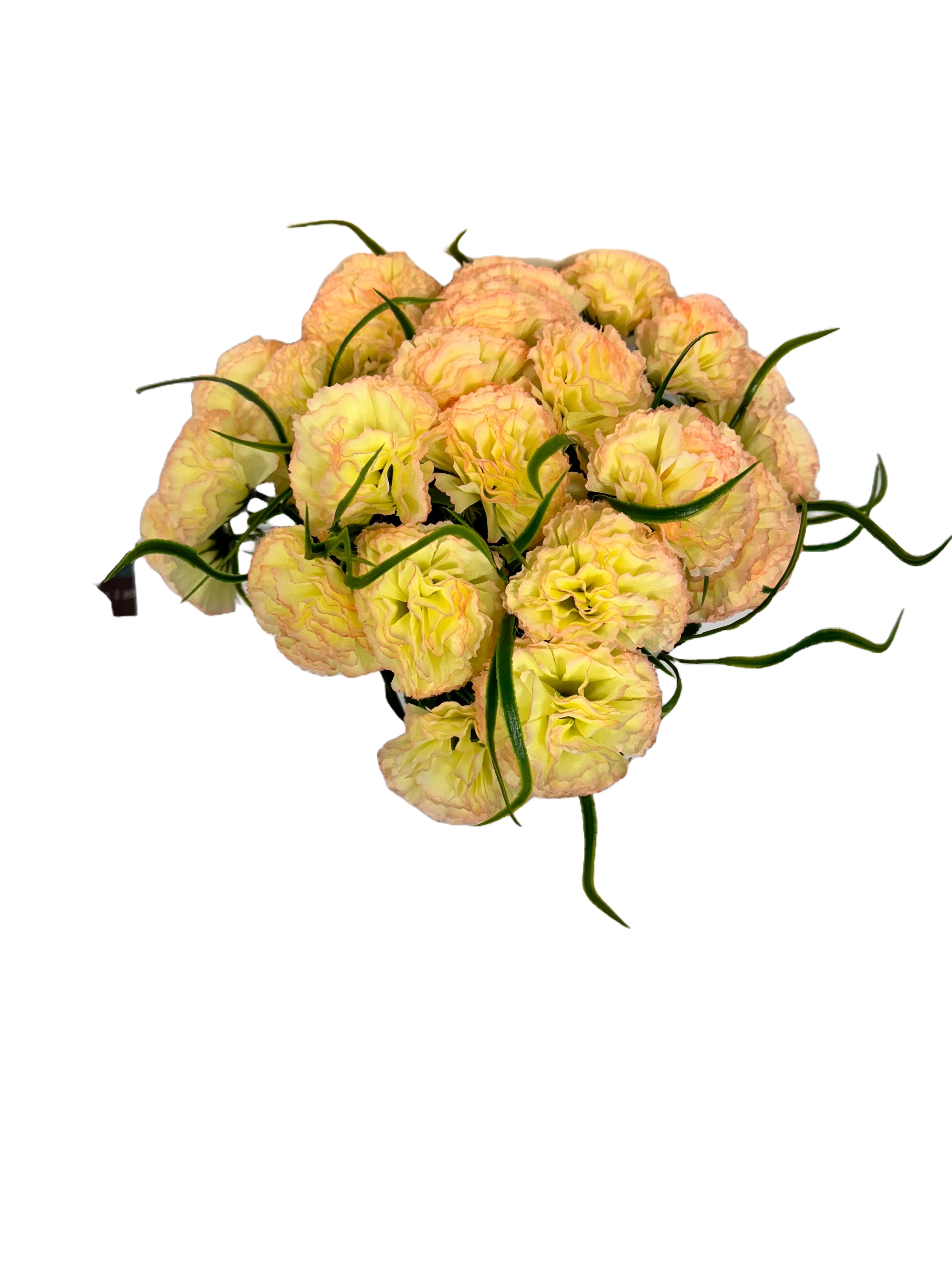 Okazały bukiet sztucznych goździków w intensywnie żółtym odcieniu. Składa się aż z 24 dużych główek kwiatów, które tworzą gęstą i efektowną kompozycję. Dzięki naturalnemu wyglądowi i starannemu wykonaniu bukiet świetnie sprawdzi się w wazonach, stroikach oraz jako element dekoracji nagrobnych.
