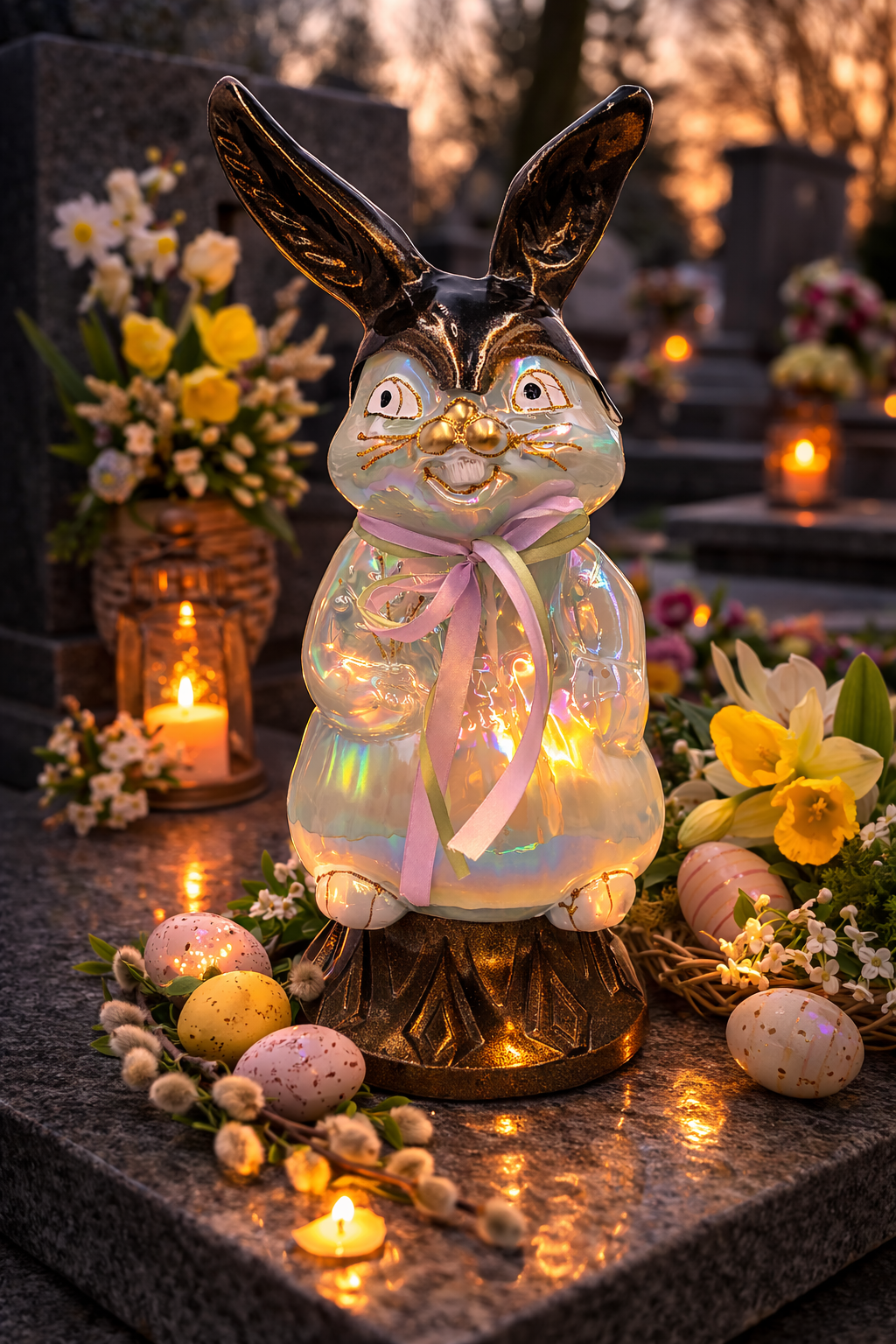 Znicz wykonany jest z wysokiej jakości szkła o subtelnym, perłowym połysku. Dekoracyjna sylwetka zająca, przewiązana ozdobną wstążką, nadaje całości ciepłego i świątecznego charakteru. Stabilna podstawa zapewnia bezpieczne ustawienie na nagrobku.