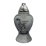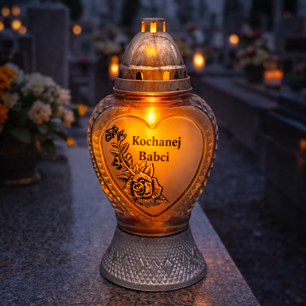 Znicz wykonany został z wysokiej jakości grubego szkła, odpornego na zmienne warunki atmosferyczne. Solidna, stabilna podstawa oraz metalizowana srebrna pokrywka zapewniają trwałość i bezpieczeństwo użytkowania. Po zapaleniu wkładu znicz emituje ciepłe, spokojne światło, które podkreśla napis i tworzy atmosferę zadumy oraz pamięci.
